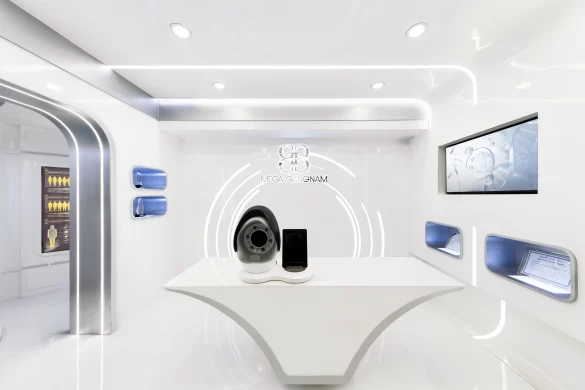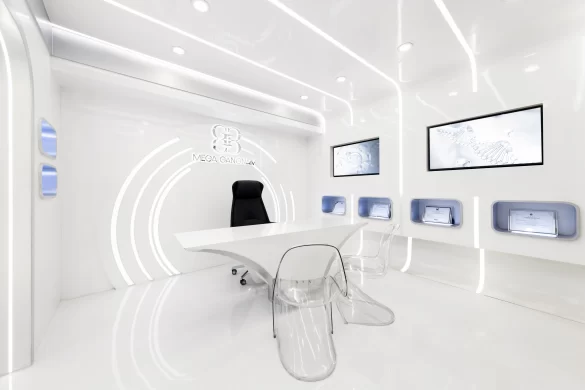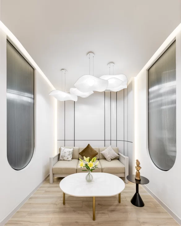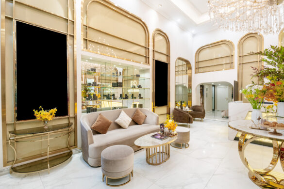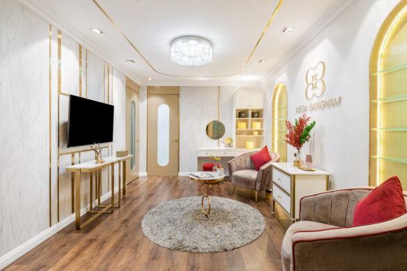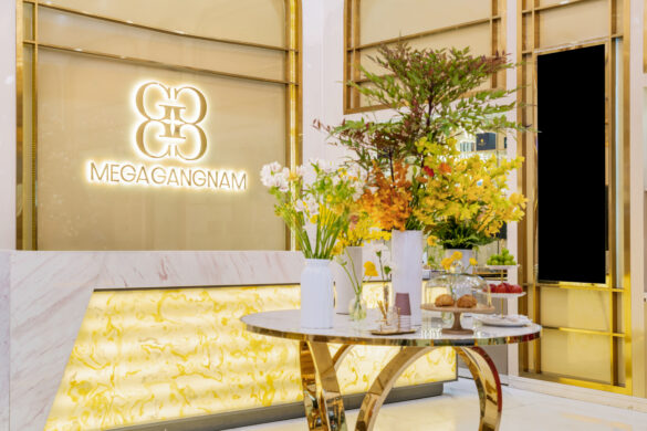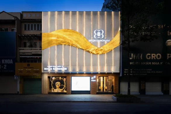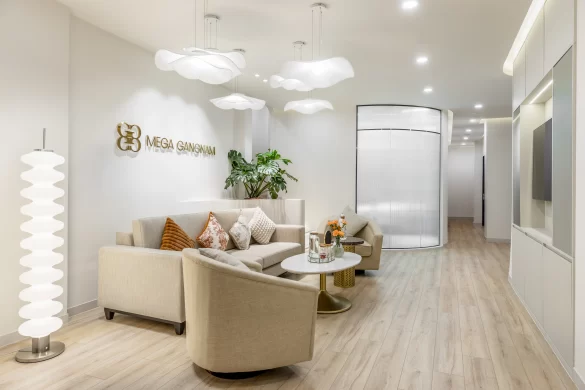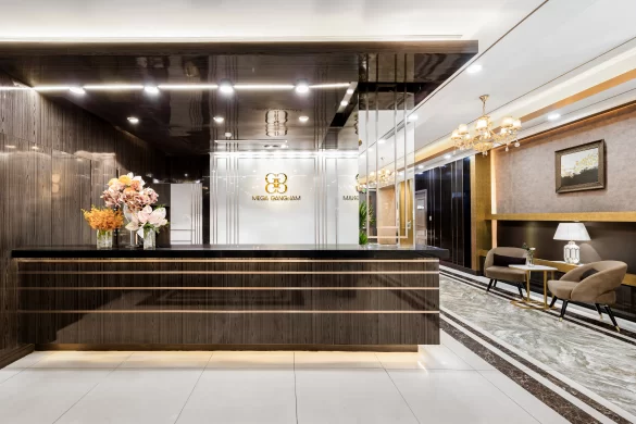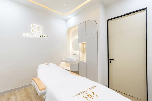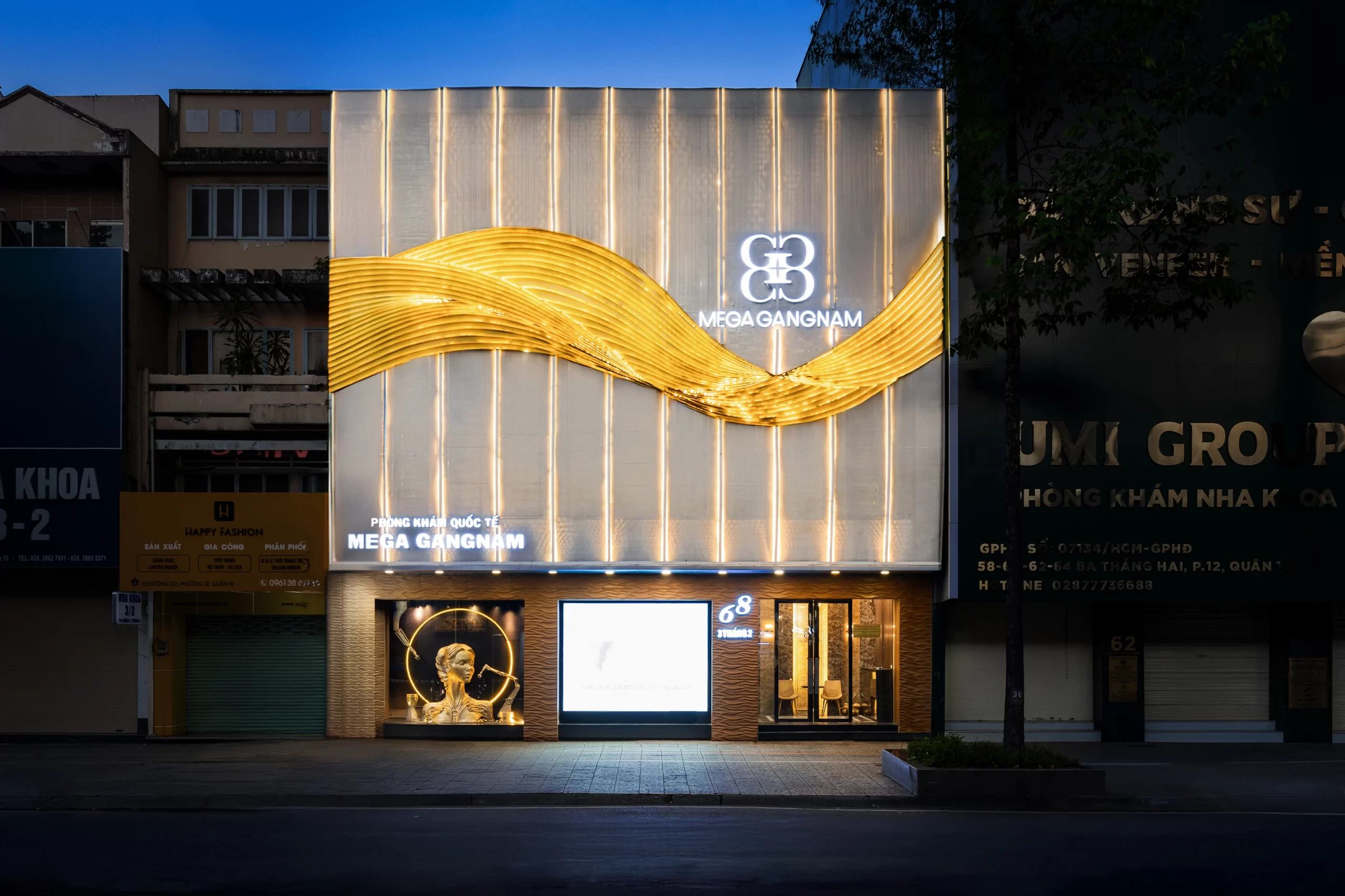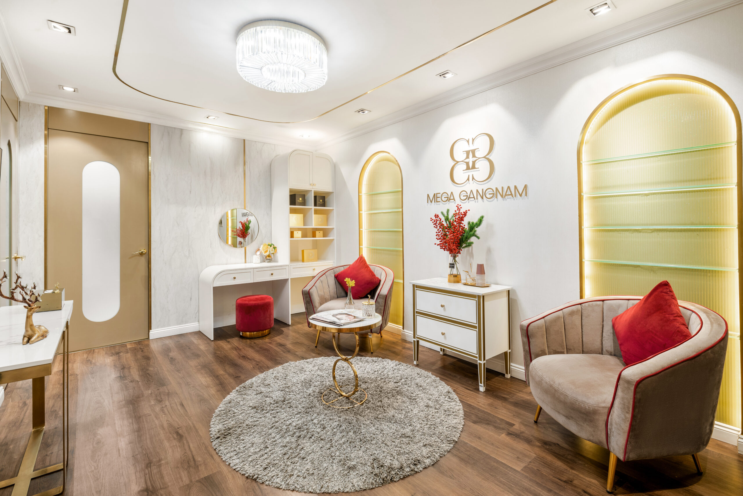 Mega Gangnam tại 68 Ba Tháng Hai, quận 10 nổi bật với mặt tiền hiện đại, thiết kế ánh sáng vàng kim sang trọng. Bước vào bên trong, khách hàng sẽ ấn tượng ngay bởi không gian rộng rãi, sáng bừng với gam trắng tinh tế, kết hợp nội thất cao cấp và trang trí hoa tươi tạo cảm giác tinh khiết, thư giãn. Khu vực lễ tân, phòng chờ và các phòng chức năng đều được bố trí khoa học, tiện nghi, mang đến trải nghiệm thoải mái ngay từ phút đầu tiên. Đây là địa chỉ thẩm mỹ công nghệ cao uy tín tại TP.HCM, xứng đáng cho những ai tìm kiếm dịch vụ chuẩn quốc tế.